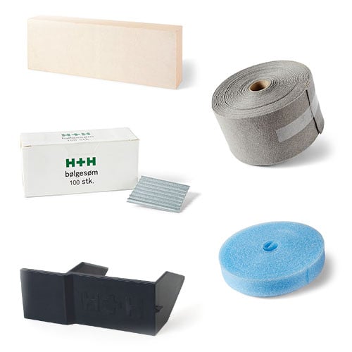 H+H Tillbehör omfattar ett brett sortiment av produkter, inklusive lim, spackel, puts, beslag, isolering, limskopa, med mera.